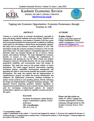 Tourism is a crucial factor in economic development, especially inareas with strong cultural traditions and scenic beauty. Situated in thefoothills of the Himalayas, Azad Jammu & Kashmir (AJK) has a greatdeal of unexplored potential for tourism growth. In addition to outliningsound tactics for developing a vibrant tourist and hospitality industry,this study seeks to assess tourism’s economic influence in AJK. Thisdissertation weighs the economic assistance of tourism in AJK over thespan of three years. The study employs a Triangulation approach e. Thisparticular study was designed through the use of surveys, officialreports, and academic literature. The study highlights the economicbenefits of tourism in AJK, including the establishment ofinfrastructure and opening the way for SMEs (Small and mediumenterprises). However, the hurdles faced by AJK are scarce marketing,geopolitical instability, and environmental issues that hamper itsrealization. This study also uncovers the ground realities of touristdestinations. The results suggest proactive interventions regardinginvestment policies, sustainable environmental management, andupgrading the skills to crack tourism potential and promote economicdevelopment. This study also analyzes that the implementation ofcapital-intensive projects can bolster the tourism infrastructure andemphasize the sophisticated econometric modeling techniques toanalyze tourist preferences and spending patterns, thereby informingthe design and implementation of targeted marketing strategies. Thisapproach involves deploying predictive analytics algorithms tosegment tourist markets based on socio-economic factors, which can beused for developing evidence-based policies for tourism'stransformative capacity as a catalyst for equitable economic growth inthe region.